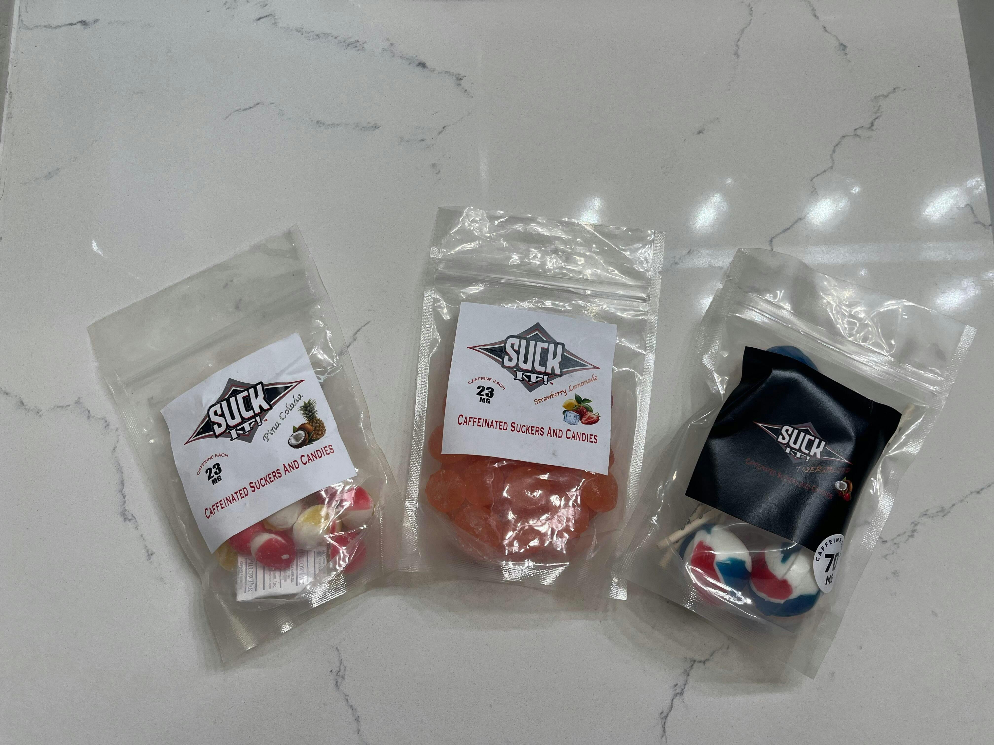 Each 8oz bag of "Suck It! Caffeinated Candies" comes with approximately 66 pieces, each packed with 23mg of caffeine in a delicious drop offering incredible results, including increased energy, mental alertness, and cognitive function. A few pieces of our candy drops will take the place of any energy drink or shot WITHOUT the water intake and side effects.